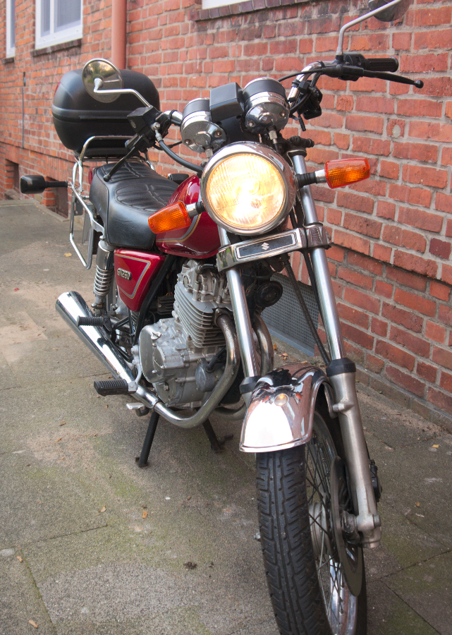 Gefunden habe ich eine Suzuki GN 250, Baujahr 1995, mit einem Zylinder und ehrlichen 18 PS.